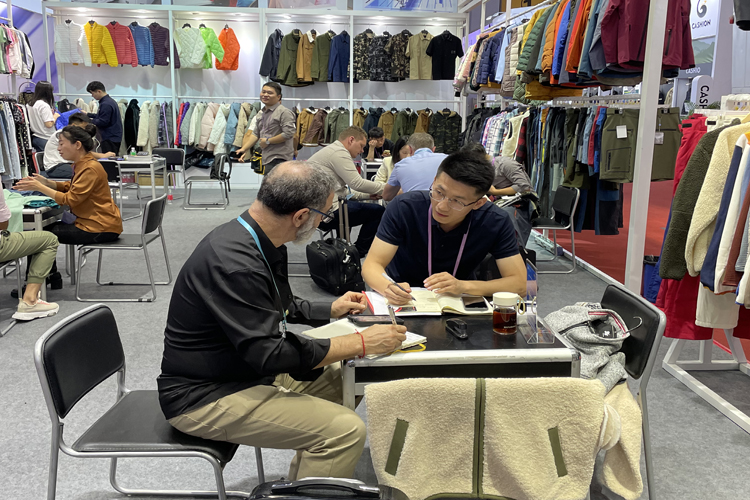 在棉服展位上,一款通道布面料做的經(jīng)典男士拼接款式棉服,防水防風(fēng)、面料舒適、方便活動;箱包展位上,新開模推出的拉桿箱頗受歡迎,在外層增加一個前口袋,內(nèi)附電腦隔層,方便電腦隨身攜帶和拿??;內(nèi)衣產(chǎn)品主打問貼膠、無縫系列,與常規(guī)的車縫內(nèi)衣相比較,無痕且舒適;鞋子展品樣式齊全、款式新穎,今年主推室內(nèi)保暖棉拖……客戶紛紛上前觀看、詢價,展位前人聲鼎沸,好不熱鬧,目前已達(dá)成多筆初步意向訂單。