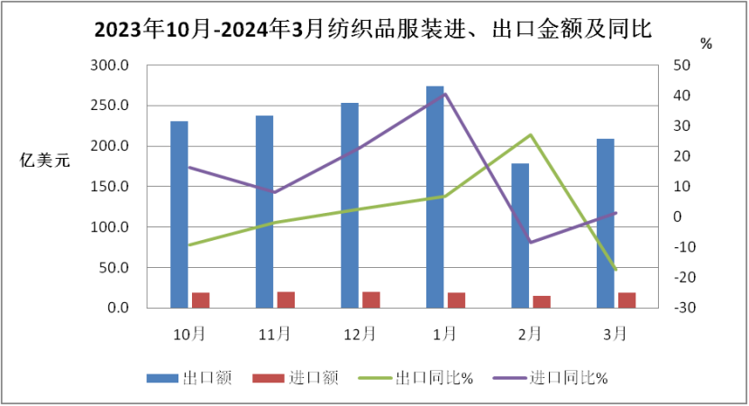 2024年1-3月,全國貨物貿(mào)易進出口總值14313.4億美元,同比(下同)增長1.5%,其中出口8075億美元,增長1.5%,進口6238.4億美元,增長1.5%,累計貿(mào)易順差1836.6億美元。3月,全國貨物貿(mào)易進出口總值5008.1億美元,同比下降5.1%,其中出口2796.8億美元,下降7.5%,進口2211.3億美元,下降1.9%,貿(mào)易順差585.5億美元。1-3月,紡織品服裝貿(mào)易額711.5億美元,同比增長2.3%,其中出口659.1億美元,增長1.8%,進口52.4億美元,增長9%,累計貿(mào)易順差606.7億美元,增長1.2%。3月,紡織品服裝貿(mào)易額226.8億美元,同比下降16.1%,其中出口208.2億美元,下降17.4%,進口18.6億美元,增長1.4%,貿(mào)易順差189.6億美元,下降18.9%。